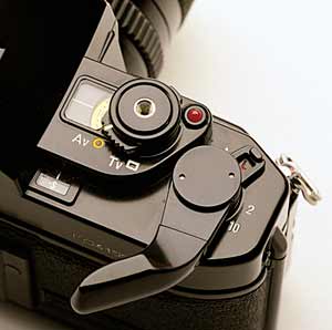 del contador de fotogramas. El visor El visor es de una calidad envidiable. La pantalla de enfoque tiene una buena luminosidad y definición hasta en las esquinas, pero sobre todo un gran tamaño de imagen, gracias al aumento de 0,83x del que pocas cámaras clásicas - y menos aún modernas- pueden presumir. Las indicaciones son escuetas y aparecen digitalmente, con esos números rojos que nos recuerdan a las primeras calculadoras. Tan sólo la velocidad y el diafragma aparecen, junto a la "M" que nos recuerda que estamos en modo manual. por mucho que busquemos no encontraremos ni indicadores del modo de exposición ni de la compensación. Es este aspecto posiblemente el más criticable de la A-1. Lo que sí que indica es la posible sobre o subexposición en los modos automáticos (con el parpadeo de los dígitos de velocidad o diafragma) y si el flash está preparado. Otras características Aparte de semejante despliegue de tecnología