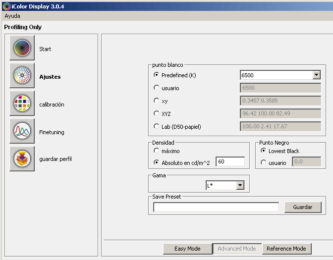 A la hora de definir los ajustes deseados para el proceso, iColor Display muestra que tiene tres modos (fácil, avanzado y referencia), siendo el segundo el que aqui ves, que además es completísimo: