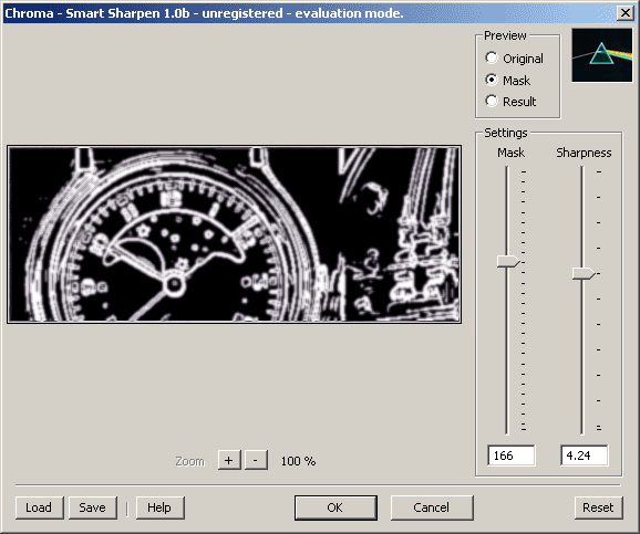 Veamos las pruebas: El efecto conseguido por este plug-in no es muy fuerte. Resalta detalles finos como las marcas horarias del reloj, pero al no afectar en absoluto a las áreas lisas produce un efecto algo irreal. En esta segunda prueba es difícil apreciar el efecto aplicado por Smart Sharpen, que es prácticamente inexistente, excepto en los contornos más visibles, como en las pestañas y en las cejas. La prueba más complicada revela que Smart Sharpen aplica un efecto de máscara de enfoque más o menos estándar, con sus efectos secundarios asociados -los famosos halos blancos-, pero con la simple añadidura de una máscara que evita que el efecto llegue a aplicarse sobre las áreas con pocos detalles, como en las texturas. Sobre el gráfico CGI se puede ver con claridad: aparecen halos alrededor de las líneas, aunque el ruido no aumenta. Con el mirlo pasa algo similar, y el efecto conseguido es bastante correcto.