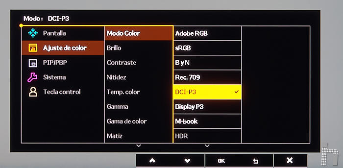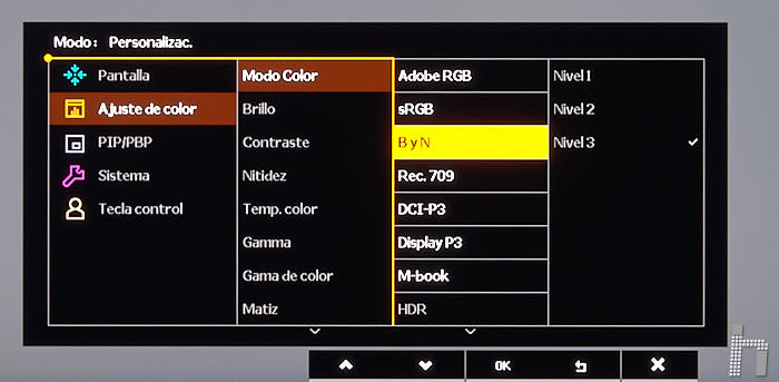- El gamut (o gama de color) permite elegir entre las gamas Adobe RGB, sRGB, Rec.709 y DCI-P3. Lo bueno de poder escoger aquí el gamut es que, a diferencia de los presets con el mismo nombre, se puede combinar con otra curva de gamma y otro punto blanco, que se puede guardar en uno de los dos modos personalizados, lo cual da mucha más flexibilidad para aprovechar el monitor como se quiera.