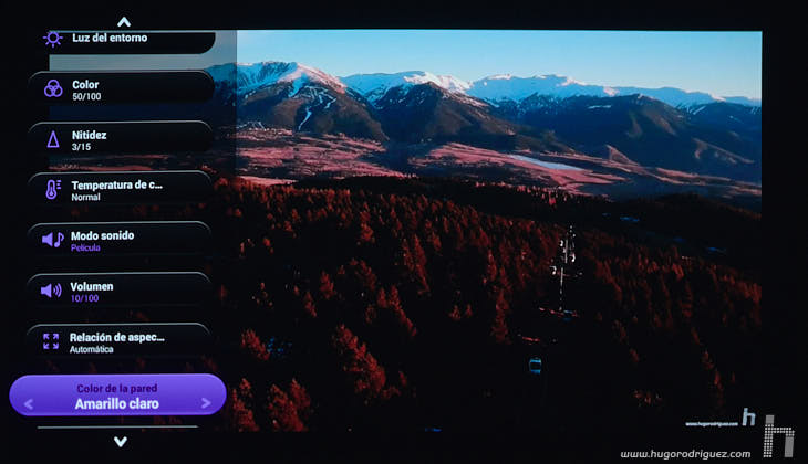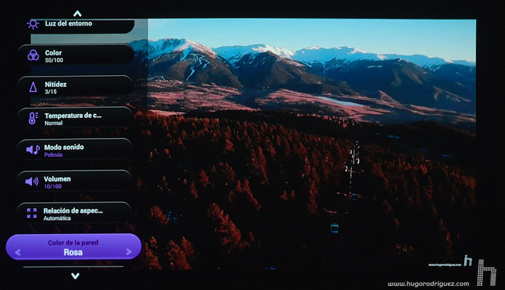 Un parámetro muy interesante y que no había visto en otros proyectores hasta ahora es el Color de la pared: un cambio en la imagen que pretende compensar la dominante que se crea en la imagen cuando la pared no es blanca. Muy interesante para cuando no hay tiempo para andar ajustando o haciendo pruebas.