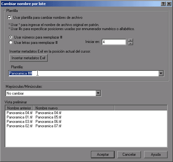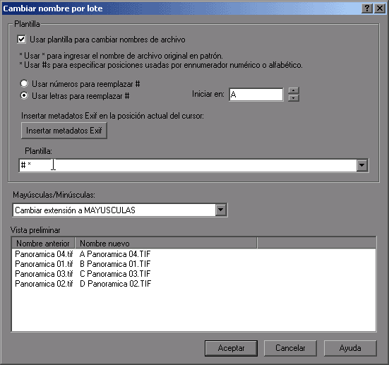Es decir, allí donde se inserte este asterisco en el recuadro Plantilla, se insertará el nombre antiguo de cada archivo. Si se pulsa Aceptar, se renombran definitivamente: