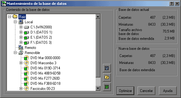 Mantenimiento de la base de datos De vez en cuando hay que darle un repaso a la base de datos, porque sino comienza a ocupar megas y mas megas. Para ello, y para evitar los fastidiosos cuelgues que a veces tiene este programa, conviene mantener a "dieta" la base de datos con la propia herramienta que tiene para esto: