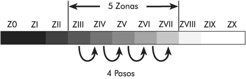 entre 2 tonos del negativo, normalmente los extremos de la escala dinámica