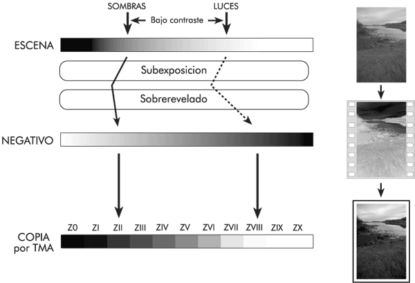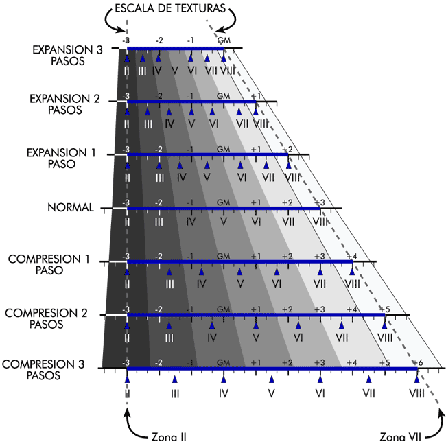 de la expansión 2 pasos, la zona II aparece situada en -2 EV). Las