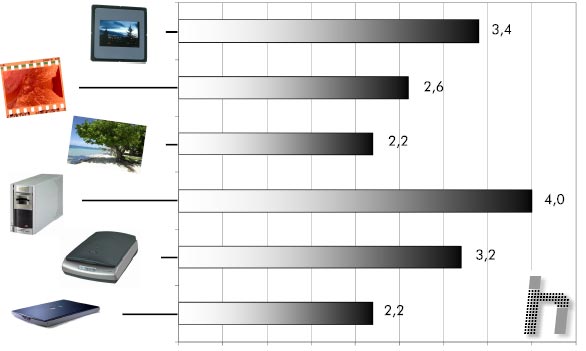 película, uno mixto (acepta opacos y transparencias) y uno de opacos. ¿Y si mi escáner acepta diapositivas pero tiene un rango dinámico de 2,2 (por ejemplo)?. Entonces te encontrarás antes uno de esos modelos que "acepta película" pero no aclara que lo que realmente escanea bien son negativos y no diapositivas. Con la siguiente tabla puedes ver cómo queda el resultado final con dos modelos diferentes, uno de poco rango y otro con suficiente: