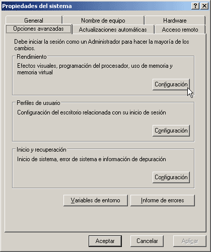 Configuración avanzada del sistema Ahora nos vamos a las propiedades de Mi PC y a la pestaña Opciones avanzadas para entrar en esta ventana: